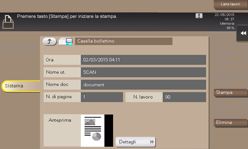 È possibile creare e registrare fino a un massimo di 10 caselle bollettino. Una volta aperta la casella utente, è possibile selezionare un documento fax memorizzato nella casella e visualizzarlo in anteprima, stamparlo o eliminarlo.