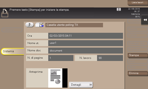 I documenti fax necessari per il polling sono memorizzati nella casella utente trasmissione polling. Una volta aperta la casella utente, è possibile selezionare un documento fax memorizzato nella casella e visualizzarlo in anteprima, stamparlo o eliminarlo.