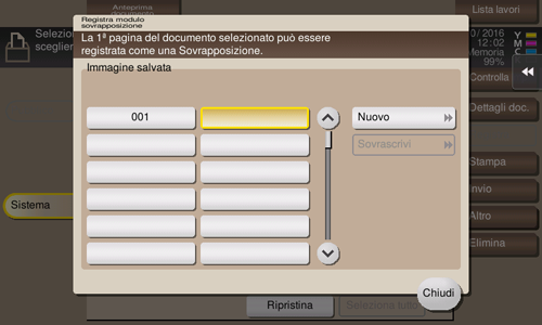 Consente di archiviare il file come immagine sovrapposizione. Una volta registrato, è possibile comporre un'immagine di sovrapposizione sull'originale durante la copia o stampa.
