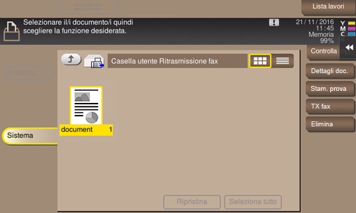 Quando il destinatario è occupato e se non è possibile stabilire le comunicazioni, i fax non consegnabili sono memorizzati nella casella utente ritrasmissione fax. Una volta aperta la casella utente, è possibile selezionare un documento fax memorizzato nella casella e visualizzarlo in anteprima, stamparlo, inviarlo o eliminarlo.