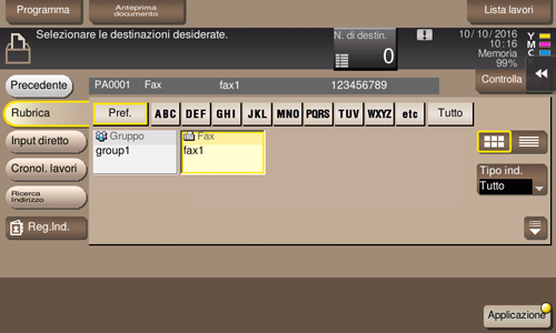 Nella Rubrica, selezionare una destinazione registrata in questa macchina. È possibile trasmettere file selezionando destinazioni multiple.