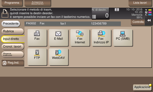 [Fax] | Inserire il numero di fax del destinatario cui inviare un fax. Quando si specificano destinazioni multiple, toccare [Destinaz succ] per aggiungere destinazioni. Facendo clic su [N. di reg.] è possibile specificare una destinazione fax per numero registrato. |