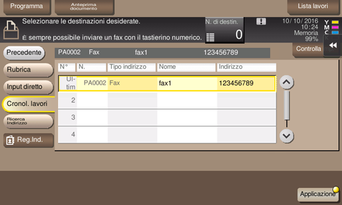 Selezionare una destinazione dalla Cronologia lavoro. I lavori più recenti (fino a cinque) sono visualizzati a scopo di cronologia. Quando necessario, è possibile selezionare destinazioni multiple nella cronologia.