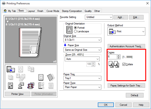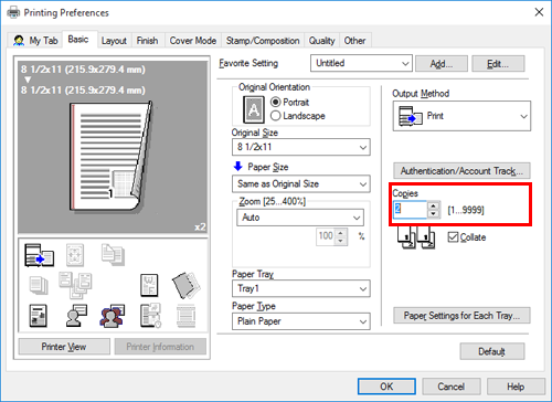 En [Copias] de la pestaña [Básico], especifique el número de copias que desea imprimir.