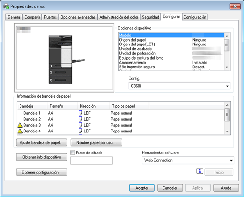 Si la comunicación OpenAPI es cifrada SSL y es posible obtener información del dispositivo de forma automática desde el controlador de impresora, la frase de cifrado puede obtenerse desde esta máquina. Para obtener más información sobre cómo cifrar la comunicación OpenAPI con SSL, consulte Aquí.
