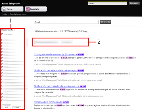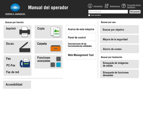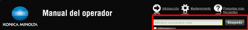 Introduzca una palabra clave en el campo de búsqueda en la parte superior del manual para buscar en el manual del operador. Introduzca una palabra clave en el campo de entrada y haga clic en [Buscar].