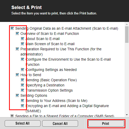 Seleccione las casillas de verificación que desee y, a continuación, haga clic en [Imprimir]; podrá imprimir colectivamente los contenidos seleccionados.