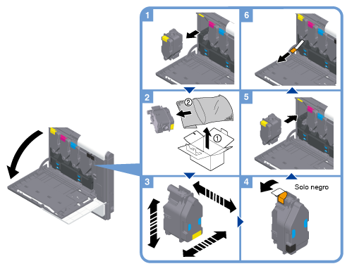 Agite bien un nuevo cartucho de tóner, entre 5 y 10 veces hacia arriba y hacia abajo, hacia delante y hacia atrás, y hacia la izquierda y la derecha.