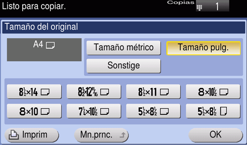 [Tamaño pulg.] | Seleccione esta opción para escanear un original de tamaño en pulgadas. Toque [Tamaño pulg.] y seleccione un tamaño en pulgadas estándar. |
