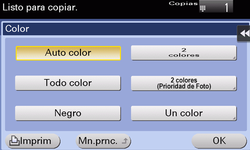 [Color automático] | Selecciona automáticamente [Todo color] o [Negro] según el color del original escaneado para la copia. |