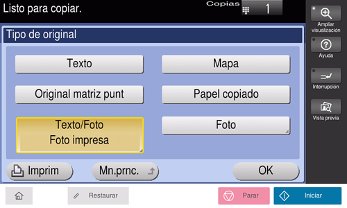 [Texto] | Permite copiar un original que conste principalmente de texto, al nivel óptimo de calidad de imagen. Esta función acentúa los bordes de cada carácter, lo que da lugar a imágenes fáciles de leer. |