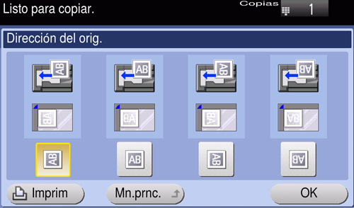 Toque [Original/Densidad] - [Dirección del original] y especifique la dirección de carga del original.
