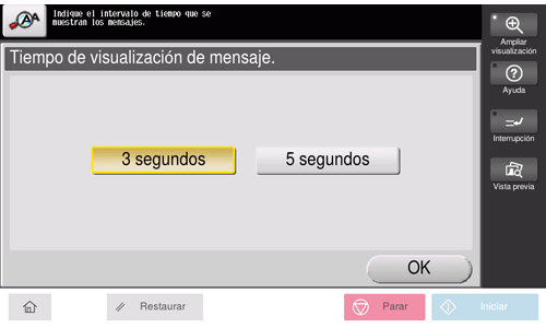 Permite cambiar el tiempo de visualización de los mensajes en la pantalla de la máquina.