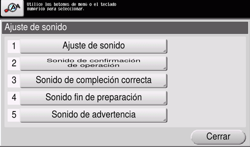 Permite especificar sonidos como los de las teclas o los sonidos de advertencia que notifican el estado de la máquina.