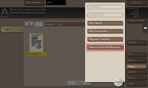 Lorsqu'une mémoire USB est connectée au port USB de cette machine, sélectionnez un fichier et appuyez sur [Autre] - [Enreg. dans Mém. ext.]. Vous pouvez maintenant enregistrer le fichier sur la mémoire USB.