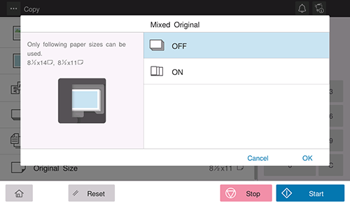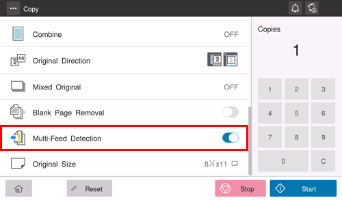 La sélection de [Détection multi-chargement] sur MARCHE arrête la numérisation lorsque la machine détecte que l'original est multiplexé sur l'ADF.