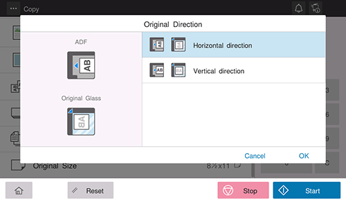 Pour numériser un original recto-verso, vous pouvez spécifier le sens de chargement de l'original de façon à régler correctement le sens vertical de l'original numérisé.