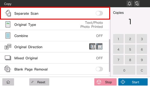 Si le nombre de feuilles de l'original est tellement important qu'elles ne peuvent pas être chargées en même temps dans l'ADF, vous pouvez les charger en plusieurs lots et les traiter comme une seule tâche. Vous pouvez également numériser l'original en utilisant alternativement l'ADF et la Vitre d'exposition.