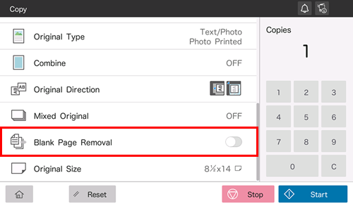 Lorsque [Supprimer pages vierges] est spécifié pour numériser un original comprenant des pages vierges à l'aide de l'ADF, les pages vierges sont exclues des cibles de numérisation. Les pages vierges détectées ne sont pas comptabilisées dans les pages d'original.