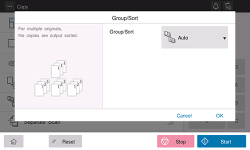 [Auto] : bascule automatiquement entre Tri et Groupe en fonction du nombre de feuilles imprimées pour chaque jeu et éjecte les copies. Si le nombre de feuilles imprimées pour chaque jeu est 1, la fonction Groupe est appliquée. Si le nombre est 2 ou plus, la fonction Tri est appliquée.
