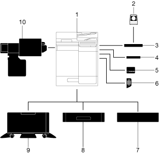 9 | Bureau DK-P05/DK-P04 | Utilisé pour installer cette machine sur le sol. Dans le manuel, cette unité est désignée Bureau. L'Bureau DK-P04 n'est disponible que dans certaines régions. |