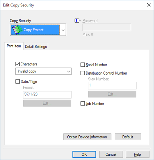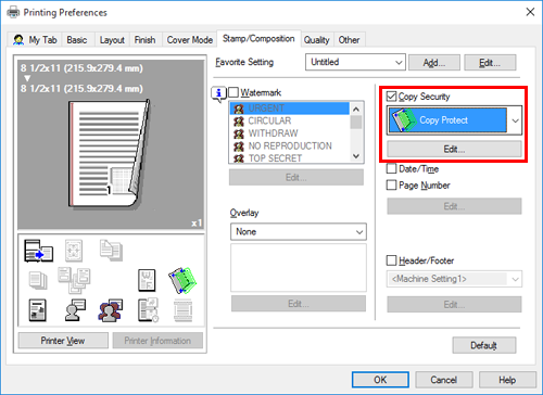 Dans l'onglet [Tampon/Composition], cochez la case [Sécurité Copie], puis sélectionnez [Protection Copie].