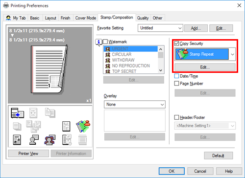 Dans l'onglet [Tampon/Composition], cochez la case [Sécurité Copie], puis sélectionnez [Tampon répétitif].