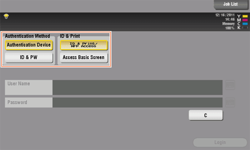 - When you select [Access Basic Screen] in [ID & Print], you can log in without starting printing.