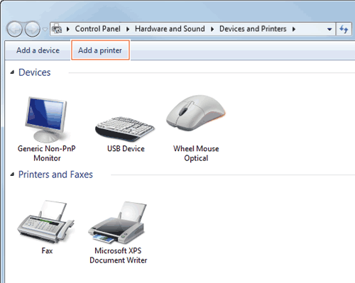 - In Windows 7/Server 2008 R2, click [View devices and printers] under [Hardware and Sound]. When [Control Panel] is displayed in an icon view, double-click [Devices and Printers].