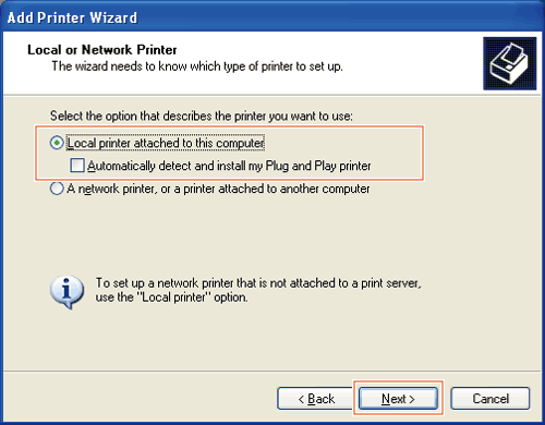 - Clear the [Automatically detect and install my Plug and Play printer] check box.