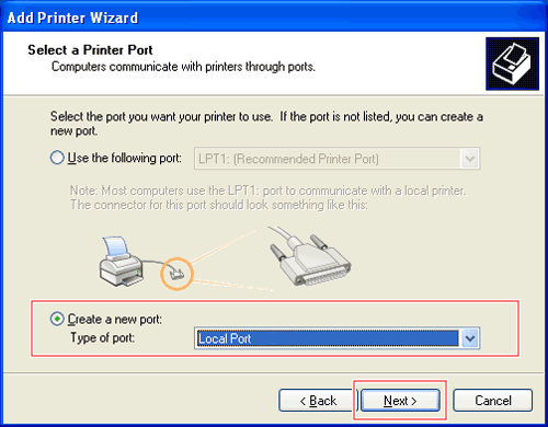 Click [Create a new port:], select [Local Port] as the [Type of port:], then click [Next >].