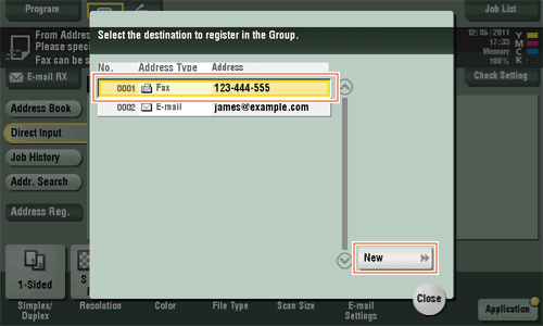 When a fax transmission to the destination which is specified by direct input is complete, tap [Address Book] and check that the destination is registered.