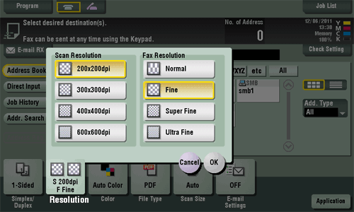 - The finer the scan resolution is, the larger the data volume becomes, resulting in longer transmission time. When E-mailing or using E-mail for sending data as in Internet fax operations, check to see if there is any limit to the data volume you can send.