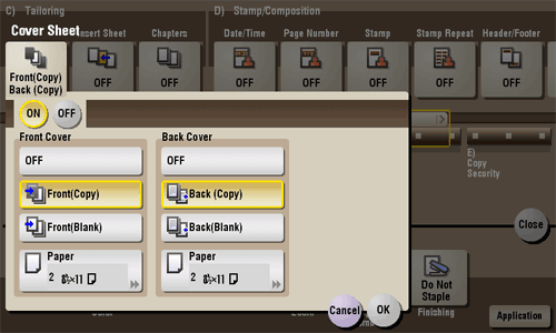 [Front Cover] | Inserts a front cover. - [Front (Copy)]: Prints the front page on the front sheet.