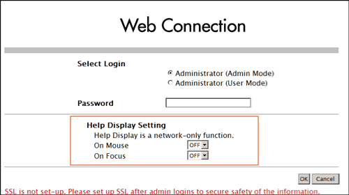 In the screen to log in to the administrator mode, you can specify the method to display the popup help.