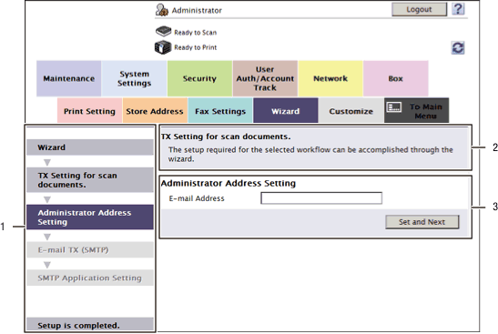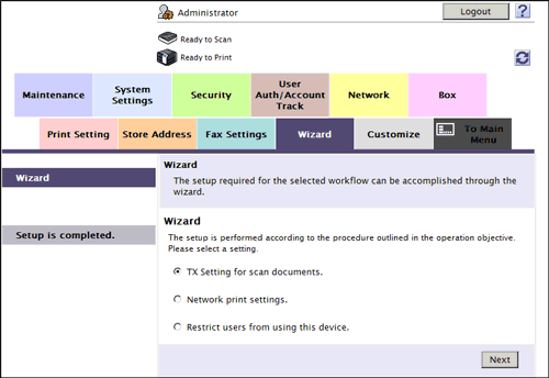 To configure settings using the wizard, log in to the administrator mode, then select [Wizard].