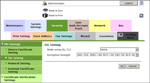 In the administrator mode, select [Security] - [PKI Settings] - [SSL Setting], then configure the following settings.