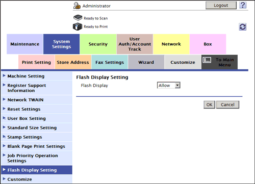 In the administrator mode, select [System Settings] - [Flash Display Setting], and set [Flash Display] to [Restrict] (Default: [Allow]).