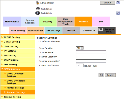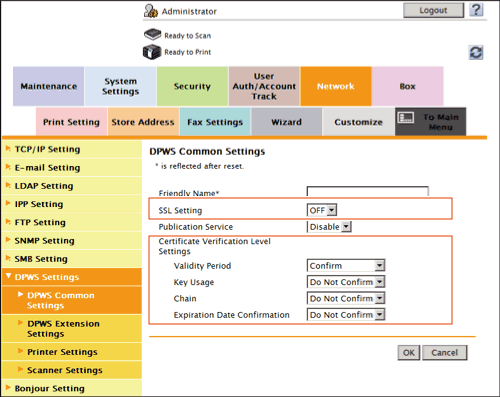 In the administrator mode, select [Network] - [DPWS Settings] - [DPWS Common Settings], then configure the following settings.