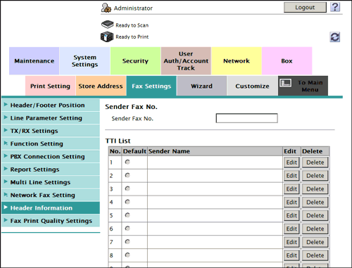 In the administrator mode, select [Fax Settings] - [Header Information], then configure the following settings.