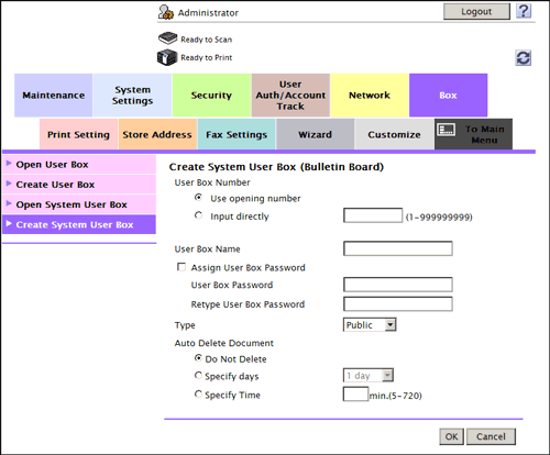 In the administrator mode, select [Box] - [Create System User Box] - [Bulletin Board User Box], then configure the following settings.
