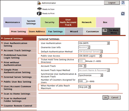 [Default Authentication Method] | If you have selected [ON (MFP + External Server)] at [User Authentication], select the authentication method you use normally. [ON (External Server)] is specified by default. |
