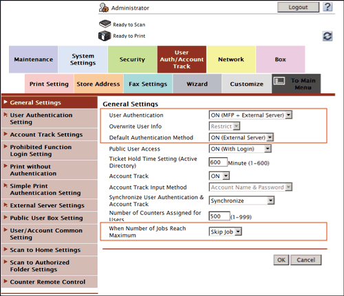 [Default Authentication Method] | If you have selected [ON (MFP + External Server)] at [User Authentication], select the authentication method you use normally. [ON (External Server)] is specified by default. |