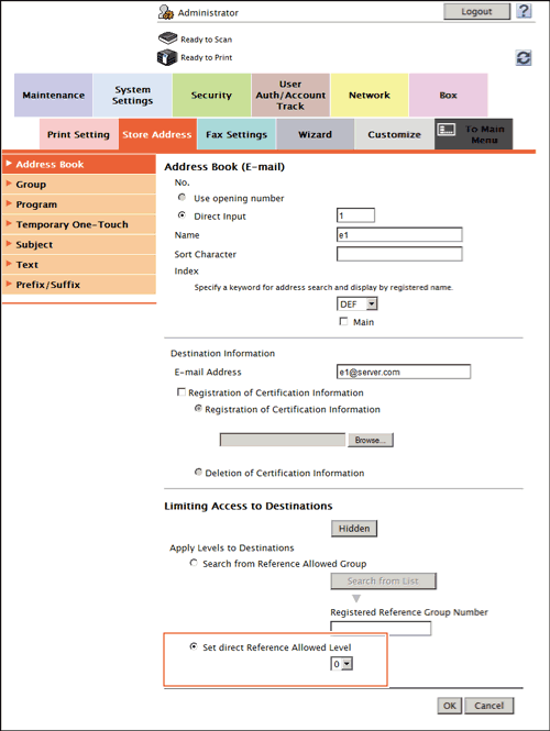 For example, assume that Level 3 is set for a certain user as an access allowed level. In this case, that user can access destinations in Access Allowed Level 1 to 3, but cannot access destinations in Access Allowed Level 4 and 5.