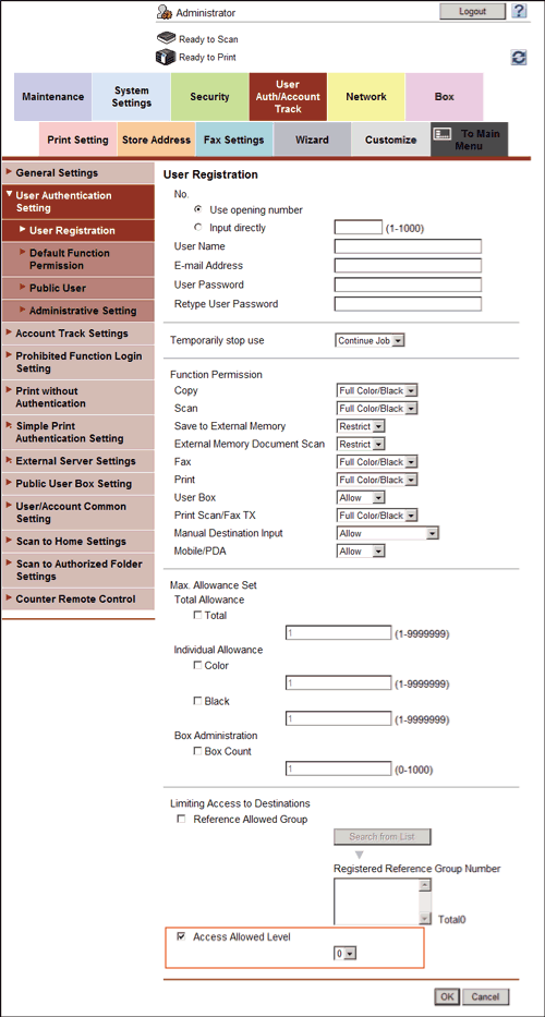This function sorts out destinations registered in this machine from Level 0 to Level 5 in order of importance to set the upper limit of the access level (access allowed level) for each user.