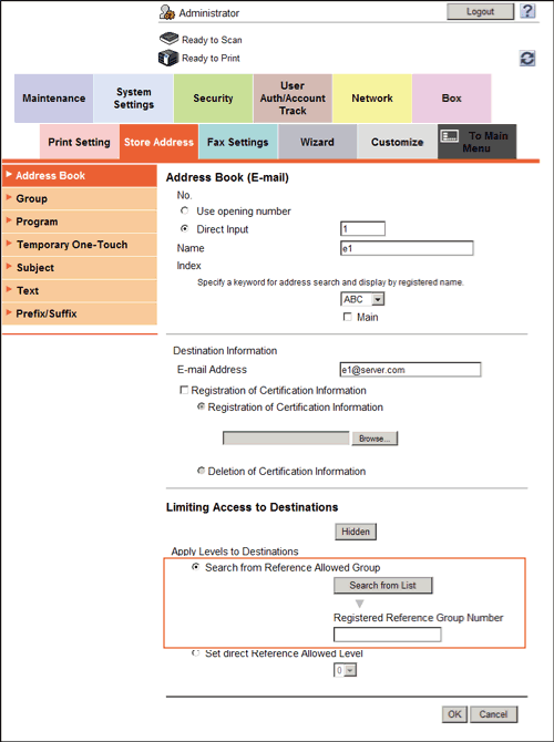 Set a reference allowed group for each user to limit access to destinations. For example, assume that Group B is set for a certain user as a reference allowed group. In this case, that user can access destinations in Group B, but cannot access destinations in other reference allowed groups.