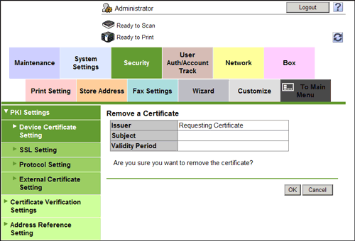 In the administrator mode, select [Security] - [PKI Settings] - [Device Certificate Setting] - [Setting] - [Remove a Certificate], then click [OK].
