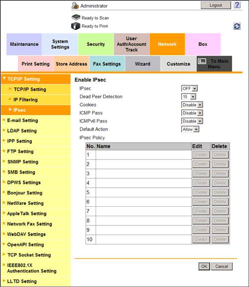 [Default action] | Select an action to be taken if no settings meet the [IPsec Policy] while IPsec communication is enabled. Select [Deny] to discard IP packets that do not meet the [IPsec Policy] settings. |