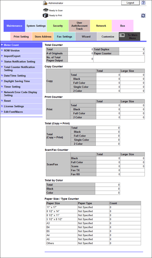 In the administrator mode, select [Maintenance] - [Meter Count] to check the information of various counters of this machine.