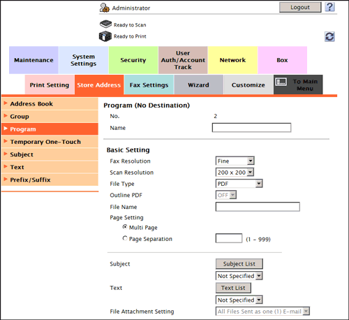 In the administrator mode, select [Store Address] - [Program] - [New] - [No Destination], then click [OK] to configure the following settings.